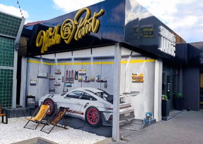 Marzysz by dotknąć Porsche GT3 RS? Wpadnij do myjni Washpoint Blizne! Ponad 500 koni mechanicznych, przyspieszenie do setki w 3,2 sek, prędkość max. 300km/h, a cena raptem 1,5 mln zł. Taką bestię zamknęliśmy w murowanej klatce, by nie uciekła. Za to można ją bezpiecznie dotknąć i nawet fotkę sobie pstryknąć. To dzieło to idealny przykład muralu 3D, gdy tworzymy iluzję przestrzeni, która nie istnieje.