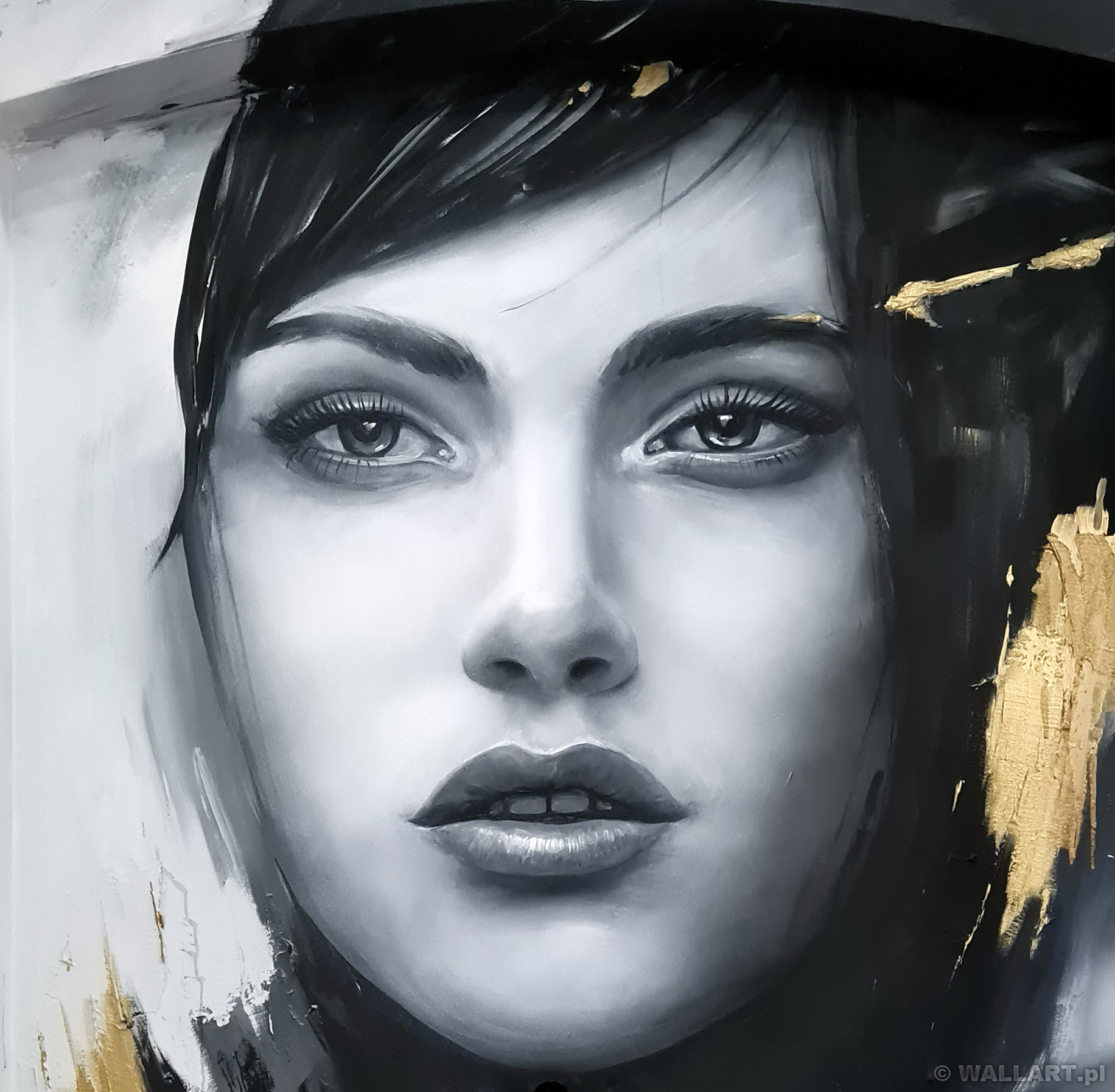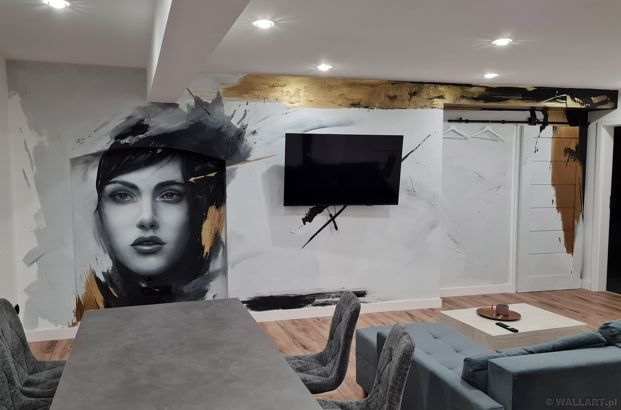 Ein modernes, elegantes Wandbild in Schwarz-, Weiß- und Goldtönen dominiert den Wohnbereich einer luxuriösen Wohnung zur Kurzzeitmiete. Das großformatige Porträt einer Frau in ausdrucksstarker, künstlerischer Form verbindet die Strenge monochromer Pinselstriche mit dem subtilen Schimmern goldener Farbe. Mit seiner dynamischen Komposition und den abstrakten Akzenten verleiht das Wandbild dem Innenraum den Charakter einer Kunstgalerie und bewahrt gleichzeitig die raffinierte Eleganz des Glamour-Stils.